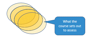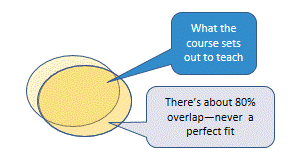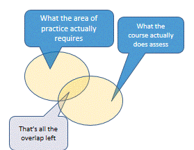Let's strip away all those intermediate accretions. Go back to the initial step, "What the area of practice actually requires." and see how the final step, "What the course actually assesses" relates to it. There may be about 15% overlap. (Do the maths on the diagram and it doesn't work, but then the real world is much messier than this discussion—sorry!)