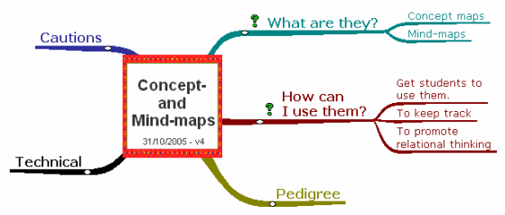 As appropriated by Tony Buzan (who seems to think he invented them; "mind mapping" is a apparently a registered trademark of the Buzan organisation), these are concept maps branching from a single central node; they are not as flexible as concept maps, but may be easier to manage by students in lectures, which notionally start from a single topic. [Back]
