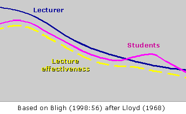 Bligh's evidence suggests a fairly steady decline in student attention (and lecturer performance) from the start to the end of a traditional one-hour (50 minute) lecture. Students blip upwards about 10-15 minutes before the end, but this has little effect if the lecturer continues to go downhill. He suggests that the limit to students' effective attention is 25-30 minutes. I think that may be optimistic, and in any case there is no point in going up to the wire.
