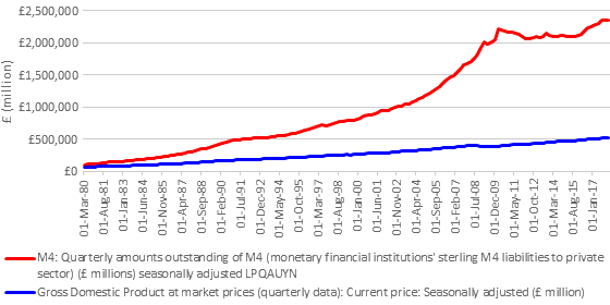 Figure 1: Broad Money (M4) relative to GDP at market prices (1980 to 2018)[1]