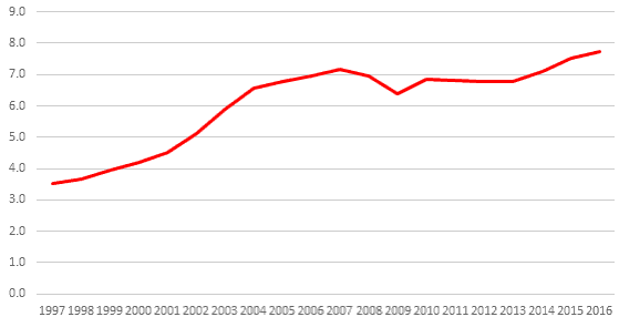 Figure 4: Growth in bank deposits during the year as a percentage of money supply at the beginning of the year (1998 to 2017)[5]