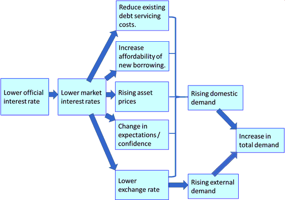 Lower domestic interest rates reduce the rate of return earned on United Kingdom investments relative to rates of return earned in other currency areas, which encourages investors to move their capital to currency areas offering a better rate of return on capital. Expectations of currency depreciation will also encourage investors to move their money out of the currency, in the expectation that they can increase their capital by moving their money back into the currency following depreciation. Investors capital transfers to other currency areas are expected to cause a depreciation in the value of a currency relative to other currencies. Currency depreciation will benefit exporters whose product price can be reduced in export markets, increasing sales volume as a consequence of making their product proposition more price competitive within industries where price competitiveness is an important basis for international competitiveness. Alternatively, exporters can maintain their prices in export markets to increase profit margins. Imported products become more expensive when a currency depreciates, which encourages consumers to substitute domestically produced products that are more price competitive following currency depreciation for imports. Therefore, currency depreciation promotes increased demand for products produced within the currency area whose interest rates have fallen relatively faster than other currency areas.