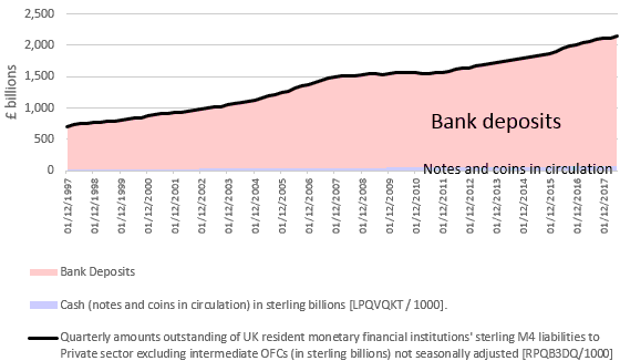 Figure 2: Bank deposits in relation to cash in circulation. The Composition of Sterling M4 Liabilities to the private sector, excluding intermediate other financial companies (OFCs)[3]