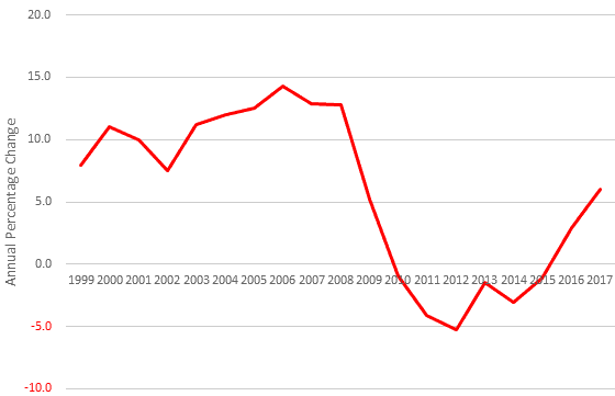 Figure 3: Annual percentage change in total lending by United Kingdom financial institutions (1999 to 2017)[4]