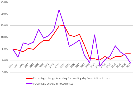 Figure 8: Percentage change in house prices in relation to percentage change in lending to purchase dwellings.