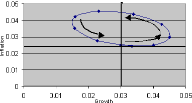 One might criticise this simulation method on the basis that, in practice, interest rate decisions are made in an environment of inherent uncertainty. Hence the central bank’s reaction function is determined in a less mechanistic way, reflecting judgement, experience, a feel for the data and so on, rather than as the solution to a loss-minimising problem. To capture this process, an alternative simulation exercise was conducted whereby the reaction function (2) was specified with exogenous values for the parameters σ1 and σ2 set initially equal to 2 and 0 respectively (σ2 = 0 implies an inflation-only target, which is the maintained assumption throughout the analysis in this paper). The resulting adjustment path, again for a positive demand shock, is shown in Figure 4. The path follows an elliptical pattern. The parameter values were chosen so that the path returns to its initial equilibrium point. However, simulations showed that this is a special case. There is a range of paths that do not return to the initial point; some are stable paths spiralling inwards and some are unstable paths that spiral outwards.
