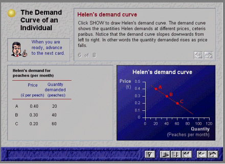 Moreover, the visual presentation employs teaching strategies based on the methods of phenomenography defined by Marton and Ramsden (1988). One such strategy is to present the learner with new ways of seeing a concept or principle (Marton and Ramsden, 1988). Diagrams in WinEcon are built up step by step. For example, in the plotting of the demand curve, a table depicting the relationship between price and quantity demanded is first presented (see Figure 2). The X–Y Cartesian of quantity demanded against price is situated next to the table. As the student clicks on each of the coordinates in the table, the corresponding point is being plotted on the graph. After all the points are plotted, a line is drawn through all the points to show the individual demand curve. WinEcon allows students to discover how the curve is built up rather than being presented with the completed diagram (Lim, 2001a).