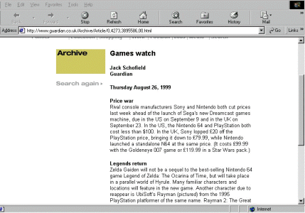 Guardian Unlimited (1999) ‘Games Watch’, Guardian Unlimited: 26 August 1999 [online]. Available from http://www.guardian.co.uk/Archive/Article/0,4273,3895586,00.html [accessed 1 October 1999].