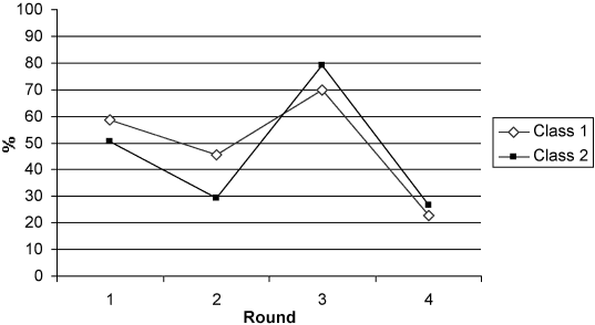 If the class agrees on a method that guarantees compliance then the remaining round results are set. In the absence of such an agreement, cooperation will increase, but typically will not reach 100%.(note 2) The amount of cooperation can vary substantially depending on the size, dynamics and composition of the class. It will not be uncommon to have cooperation in the 90% range, while around 60–70% is also possible. In either event, students will be disappointed, and this will affect the results in the last round.Contributions in the final round will be the lowest, perhaps by a large margin.