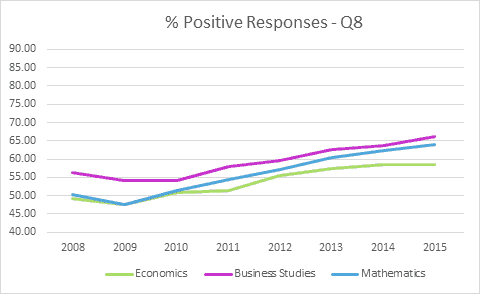 As the National Student Survey has recently opened for 2016, we thought it might be interesting to look at the development of results in economics over the last eight years and how it compares to related disciplines. The results below report overall satisfaction and selected questions from the Teaching and Assessment & feedback sections.