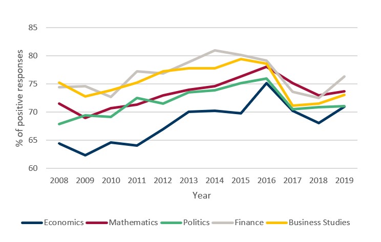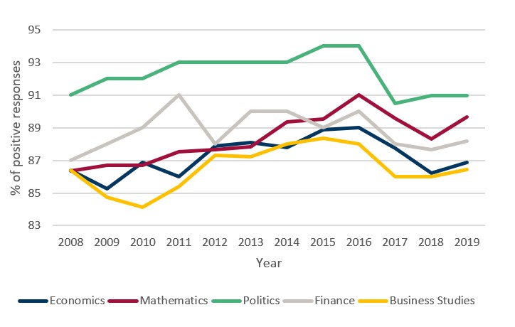 In the most recent 2019 survey, economics sees a positive response rate of 86.9%. Since 2008, economics has been ranked in the bottom two for all but 3 years. However, the positive response rates are still quite strong, with all subjects improving upon their 2018 scores.