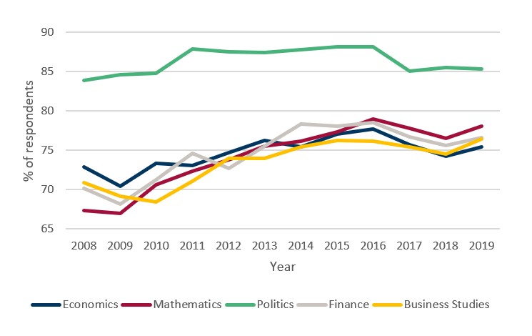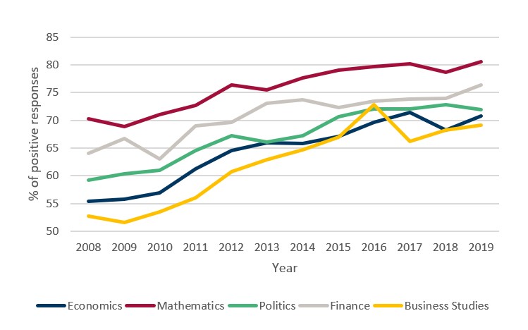 In the 2019 survey, economics receives the lowest proportion of positive responses at 75.5%. Economics, mathematics, finance and business studies all scores within 2.7 percentage points (pp) of one another. All subjects improve their score for this question over the twelve-year horizon.