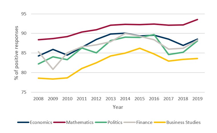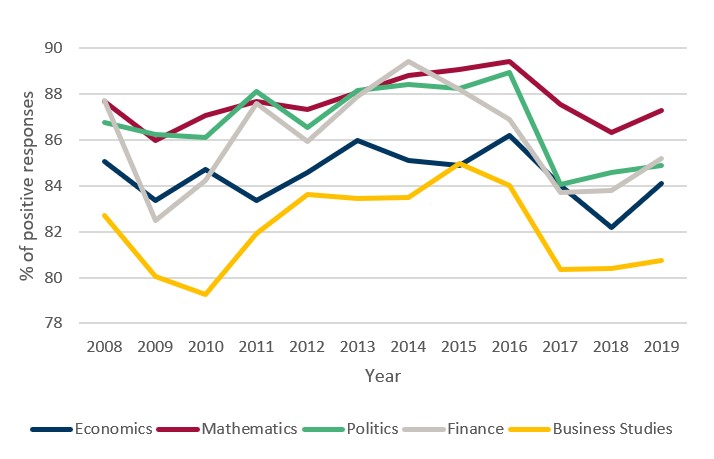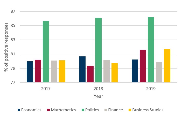 Economics scores are similar in all three years, at 80.0% in 2017, 80.7% in 2018 and 80.3% in 2019. Positive response rates increase in 2019 for mathematics, politics and business studies, with finance seeing a small decrease to 79.9%. Politics attains the highest score in all years by some margin, with a score of 86.2% in 2019. This is 4.5pp higher than the next ranking subject (business studies).
