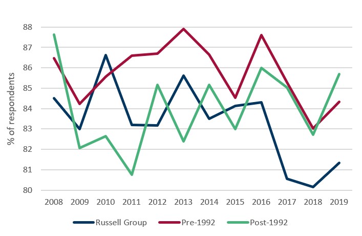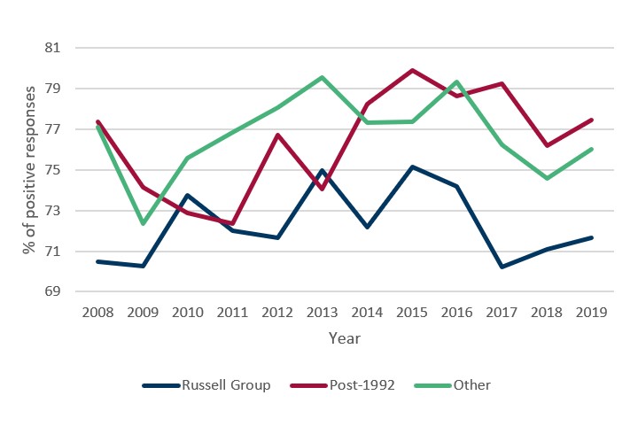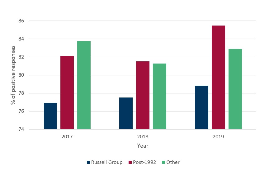 ‘Post-1992’ universities obtain the highest positive response rates for 2018 and 2019, while ‘Russell Group’ universities receive the lowest scores in all three years.
