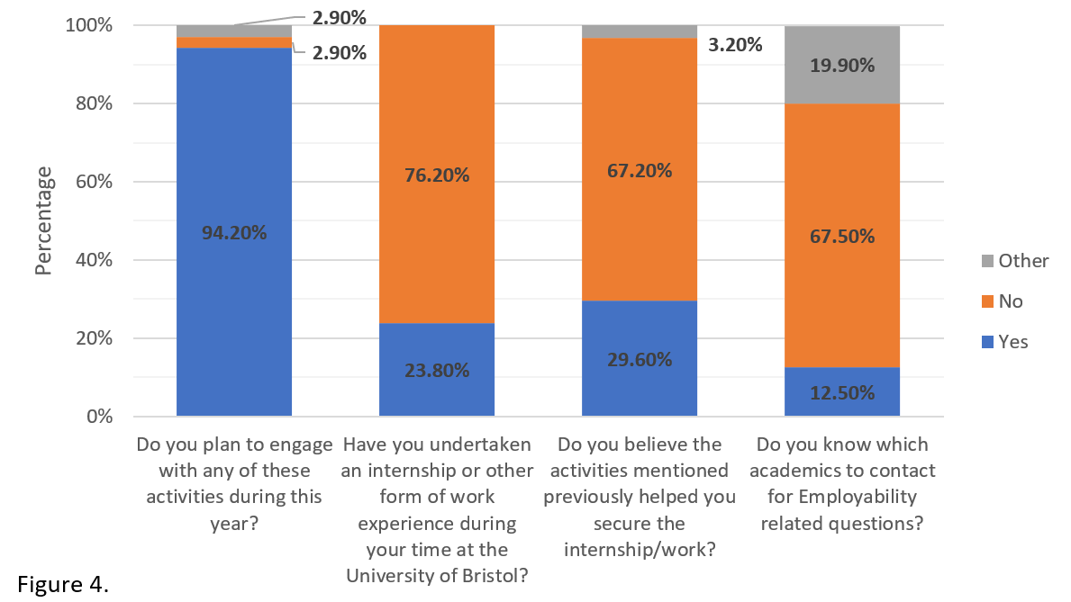 We consider this lack of engagement worrying but were already trying to improve it through the skills sessions. It does not necessarily imply awareness issues, but can also be attributed to students not considering these initiatives relevant to their needs. This was particularly important for us to clarify, as it would require us to redesign and change the focus of these initiatives. We have clear evidence that this is not the case (Figure 4), since more than 94% of students expressed a clear intention to engage with these activities. It would be necessary, however, to understand why students, even though they are interested, did not engage in the past. It should be noted that the vast majority of undergraduate students focus more on gaining work experience and exploring potential career pathways in their second year. This might be a key reason why we do not see greater past engagement.