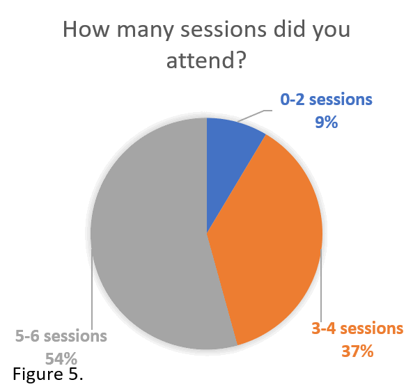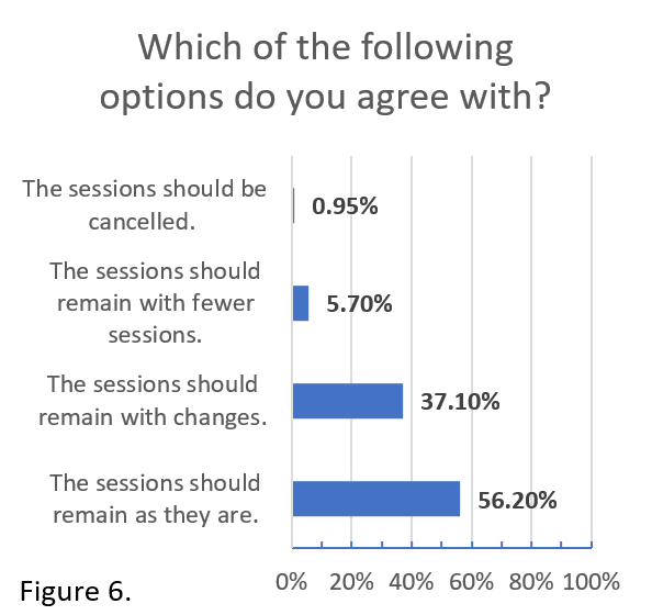 This questionnaire was completed by 105 students and 91% of them reported attending at least half the sessions (Figure 5). More than 50% of students agreed that the sessions should remain in their current form, while fewer than 1% believed the sessions should be cancelled. Approximately 42% of students were in favour of maintaining the sessions but suggested changes in terms of their number or content (Figure 6).