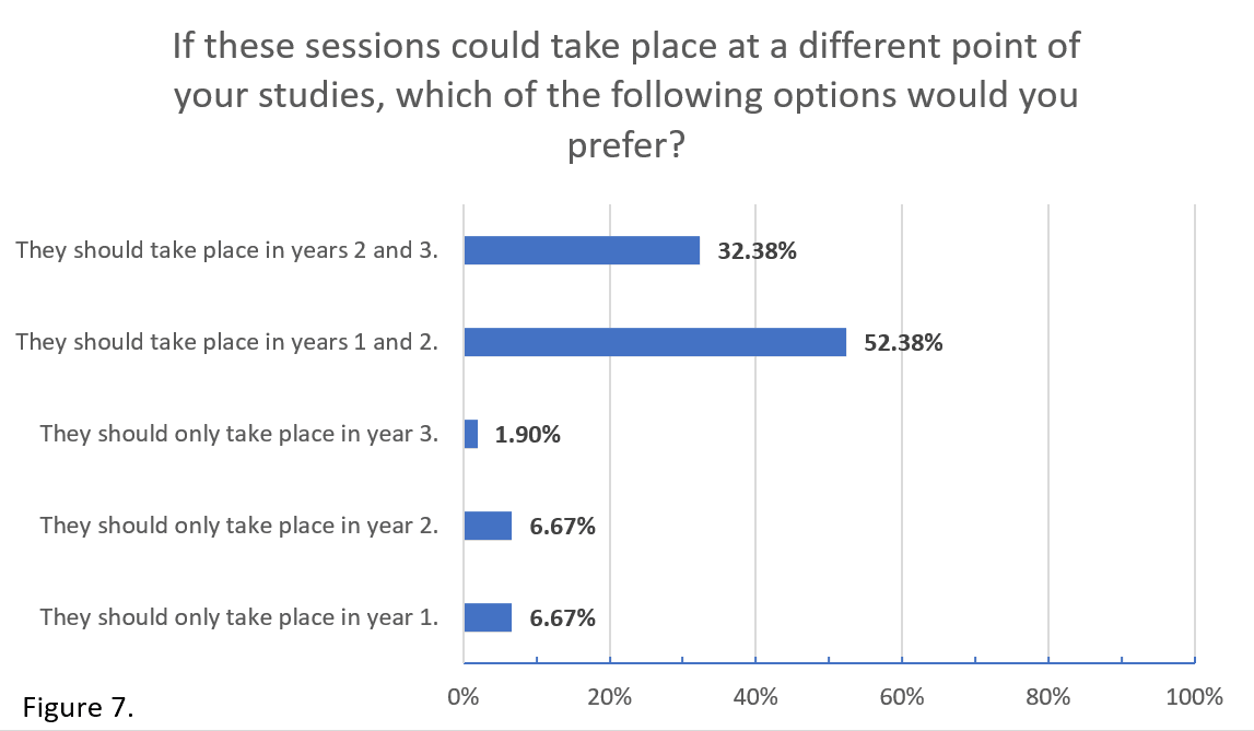 An important issue that arose while preparing these sessions was timing. At times, we felt that the students would have benefitted more by some sessions if they had been scheduled at different points during the academic term. This is partly due to restrictions related to university policies (e.g. these sessions cannot take place during student vacations or exam periods) but also due to COVID (e.g. deadlines were shifted or activities were cancelled). It was important to know if students would have preferred to have these sessions at different points during their studies. To our surprise, about 85% of students responded that they should be extended to more than one year, either in years 1 and 2 or years 2 and 3. It is evident from the response in the first question that students want longer-term employability support that expands over more than one year of their studies. An indirect observation is that the content matched the timing of students with respect to their degree progress and future aspirations as their studies progress. The students could have reported that the content was suitable for first year students, i.e. too basic, or not suitable to the needs of second or third year students. There were no such responses, which we treat as evidence of suitability.
