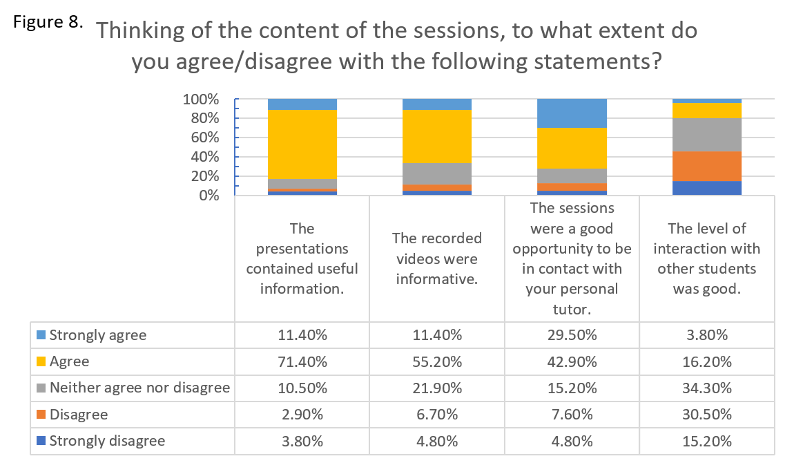 To better understand content delivery and the usefulness of the sessions, we explicitly asked a series of questions on the level and quality of information and level of contact students experienced (Figure 8). 82% found the content useful, 66% found the recorded interviews informative, and even though they do not consider the sessions to be particularly interactive amongst students (despite our best efforts), 72% found they were a good opportunity to be in contact with their personal tutors. This is a very encouraging result because one of the issues we were trying to address through these sessions was the limited communication between students and personal tutors.