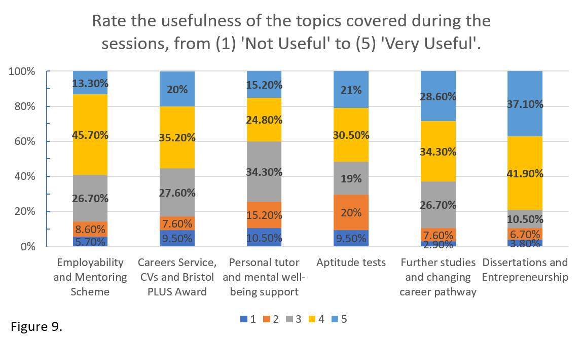 Another important aspect was whether the information we considered important enough to include in these sessions is also considered important and useful by students. Since this was our first, trial, year, we did not have past feedback on student needs and interests. We encouraged students to suggest topics of interest for future sessions but these topics were incorporated with the rest, not segregated. We wanted to check if there was a difference in the perceived usefulness of the topics proposed by students. Figure 9 summarises our findings. More than 50% of students rated each session as useful or very useful, apart from the session on wellbeing support (40%). The most successful were the sessions on further studies and alternative career pathways and on dissertations and entrepreneurship. Both sessions contained topics that were suggested by students which might have contributed positively to the responses.