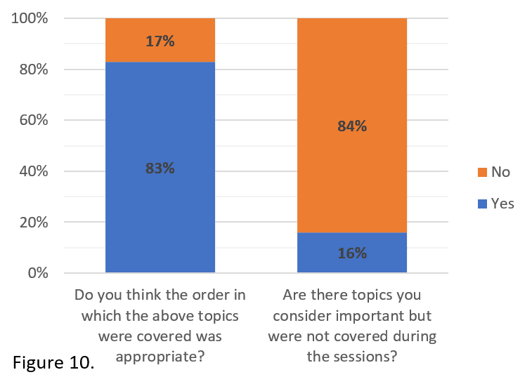 More than 83% of students felt that the selected topics were the most important (Figure 10) and that the order was appropriate. Combined with previous results, it is safe to conclude that students wanted the sessions to be extended throughout their studies because they felt the sessions contained useful content. We asked students to propose topics for future reference. The most frequent suggestion was more specialised and tailored support, such as entering specific career pathways or a more advanced level of information in topics that were covered but in less detail than some students would have liked.