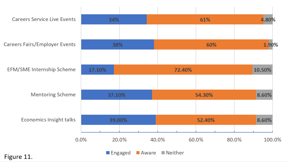 It should be noted that we are not aware of the type of information students were looking for in these websites, which means we might be overestimating student awareness of the employability initiatives. To cover that aspect, we asked students whether they engaged with those initiatives. Student responses (Figure 3) reveal that the vast majority of students had not engaged with these activities so far in their studies. The initiatives with the highest engagement were careers fairs (20.9%) and Economics talks (23.5%). Both types of activities are heavily advertised within the School, through newsletters, student societies and, in some cases, mentioned during lectures.