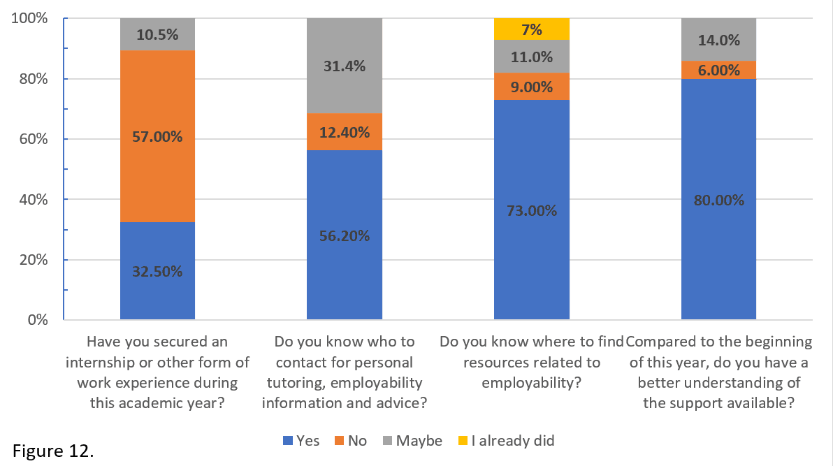 Roughly one third of our students secured an internship during their second year (Figure 12). It is worth mentioning that a further 10.5% of students were still waiting for the outcome of their applications. The pandemic has been especially harmful for placement and internship schemes, since many were cancelled or postponed indefinitely. With this in mind, many students decided to focus on acquiring other relevant accreditations, which was discussed during the skills sessions.