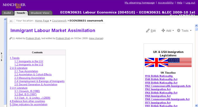 In 2009/10 the wiki-based assessment was introduced to replace the essay, i.e. to count for one third of the overall mark of the module. Students were divided into groups of 5-8 people (the initial plan was groups of 5 but this was not always practical due to timetabling considerations) and each group was assigned a different topic. Each topic was essentially a short essay question or a set of “tutorial” questions based on one of the lectures and the questions were designed to set students off exploring their textbooks and the academic journal literature on some aspect of labour economics. However, instead of writing an essay each group was expected to produce, within a period of 5 weeks, a section of a wiki dealing with their topic. During this period of time the wiki section would be available only to group members but each group member was free to edit and modify the wiki section as they saw fit. Once all wikis had been submitted and assessed, all of the wikis were thrown open to all students on the module, forming an online textbook about the labour economics course which the students themselves had effectively written. This online resource, which could still be edited by all students and the instructor, then helped the students to revise for the final exam.