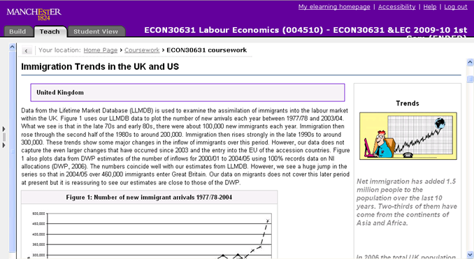 The project involved the creation of an assessment activity based on the production, by students, of a wiki. This formed one-third of the total mark for a Level 3, one semester, undergraduate module in Labour Economics taught at the University of Manchester in 2009/10. The wiki-based assessment, which was delivered through the virtual learning environment Blackboard, was intended to: