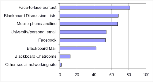 Figure 2: Methods of communication between students working on the wiki-based assessment. Horizontal axis measures percentage of students reporting using that method.