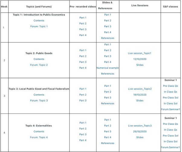 This case study outlines some of the innovative features I have incorporated (in response to the pandemic) in the final year optional module, Economics of Public Policy in Autumn 2020. This module is primarily aimed to equip students with various tools of analysis and skills that can be applied to selected theoretical and applied problems in the economics of public goods, fiscal federalism, externalities and taxation, as well as in some aspects of political economy. A series of bespoke pre-recorded materials with live sessions that encouraged advance preparation and peer learning enabled me to deliver successfully on the challenging and new environment in which we had to deliver our modules.