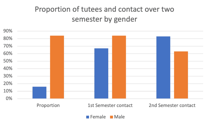 For all the students I maintained notes in Excel throughout the year, not only for accountability but also to use for future meetings to help support them towards their goals (Allen, 2002). It was important for me to understand if most of my tutees are taking up meetings with me and at what rate. The following graph shows the proportions of male and female tutees as well as the rate at which they established contact with me over two semesters. The majority of my tutees are male, and I have had a significant proportion of tutees taking up at least one meeting or emailing me throughout this year.