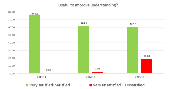 Data used to evaluate this intervention were collected through anonymised surveys designed by the author, copies of which can be provided upon request. Data were collected over three academic years 2013/14, 2014/15 and 2015/16. Figure 1, presents our results. Figure 1a shows that a clear majority of students (58-68%) are satisfied or very satisfied with CA. Yet more encouraging, as shown in Figure 1b a greater proportion, 60-75%, argue that CA are useful to improve their understanding. Hence, students find that our innovation provides useful feedback.