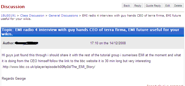 - The students were required to collect information on their firms that they thought was either related to the concept of the week or was just interesting. This was then brought to the seminar and discussed.