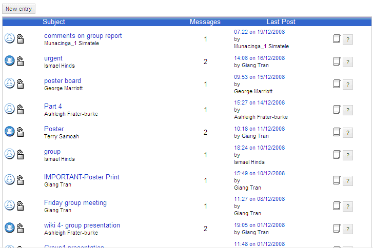 About 45 percent of the class engaged with the wiki idea of collecting information. Eventually the engagement increased to about 70%. The engagement improvement seemed to correlate with the times close to the formal feedback dates. It is possible therefore that rapid increase in engagement was assessment driven. The engagement with the online sites was about 45%. However, those who did not use their specific group sites used the open discussion sites. The appendix shows screen captures from both examples.