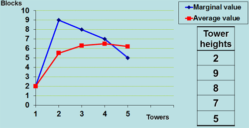 | Tower number | Height of this tower (in blocks) | Total height so far | Average height (blocks per tower) | Marginal height (in blocks) |