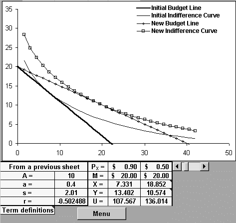 The workbook proceeds to break the effect shown above into the effect due to substitution and that due to the impact of the price change on real income. It phrases the information above and that related to the above-described decomposition in terms of the compensated and uncompensated demand curves.