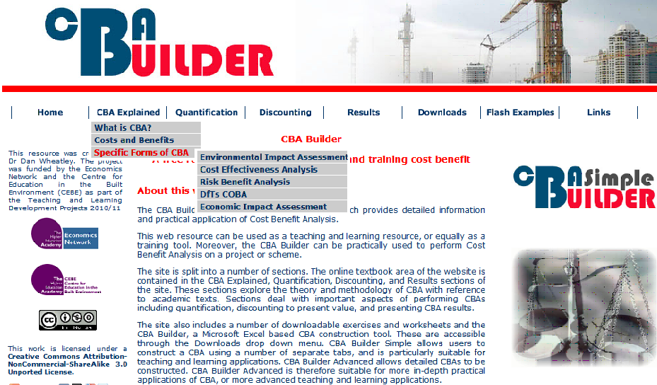 ‘CBA (Cost Benefit Analysis) Builder’ is a free-to-use web-based interactive teaching and learning resource, which can be used by students to aid in their understanding of cost benefit analysis. CBA is used widely in industry in both the public sector (e.g. the UK Department for Transport’s COBA) and also in the private sector. In this sense, improving the quality of teaching and learning of this subject, and student engagement with it, will help to improve student employability by providing students with skills that will be sought by employers.