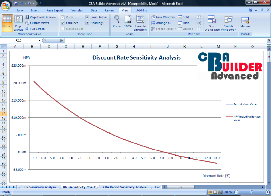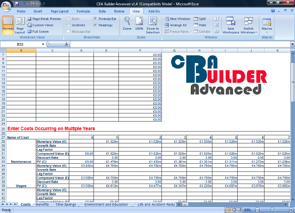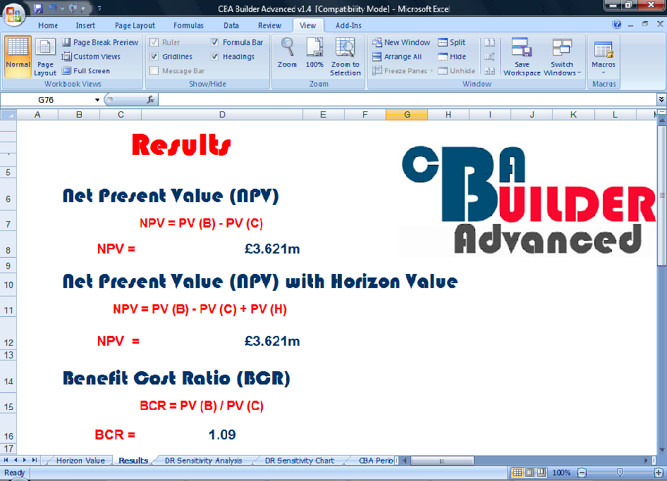 The resource is available at www.cbabuilder.co.uk. Following the original objectives, the resource contains an online textbook, flash animations, and a detailed links section containing links to relevant textbooks, journal articles, and web resources. The site also includes CBA Builder Simple and Advanced Excel-based CBA construction tools. CBA Builder Simple allows users to construct a CBA using a number of separate tabs, and is particularly suitable for teaching and learning applications. CBA Builder Advanced allows more detailed CBAs to be constructed. CBA Builder Advanced is therefore suitable for more in-depth practical applications of CBA, or more advanced teaching and learning applications. The CBA Builder tools allow users to enter one-off costs and benefits, recurring costs and benefits, discount to present value, compound values, produce results (NPV, BCR), perform discount rate sensitivity analysis, and perform CBA period sensitivity analysis (see screenshots 2-5). Finally, the resource includes a series of downloadable exercises and worksheets, many of which are designed for use with the CBA Builder Simple and Advanced tools (see example in screenshot 6 and 7).