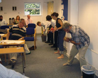 If the space available is limited in some way so the students very quickly start getting in each other's way, the students seem to grasp a range of possibilities as to the cause of falling output very quickly. For example, if the production line is reasonably tightly packed between the two buckets, the workers start knocking each other and dropping more balls which can also lead to an interesting discussion on quality issues.