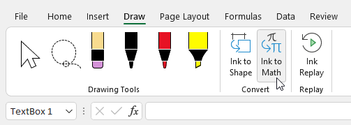 In Excel, this is done from the Insert menu by selecting "Menu" and choosing the "Ink equation" option from the foot of the drop-down list. If you customise your ribbon, you can enable a "Draw" tab with a dedicated button. Word and PowerPoint have this "Draw" tab enabled by default.